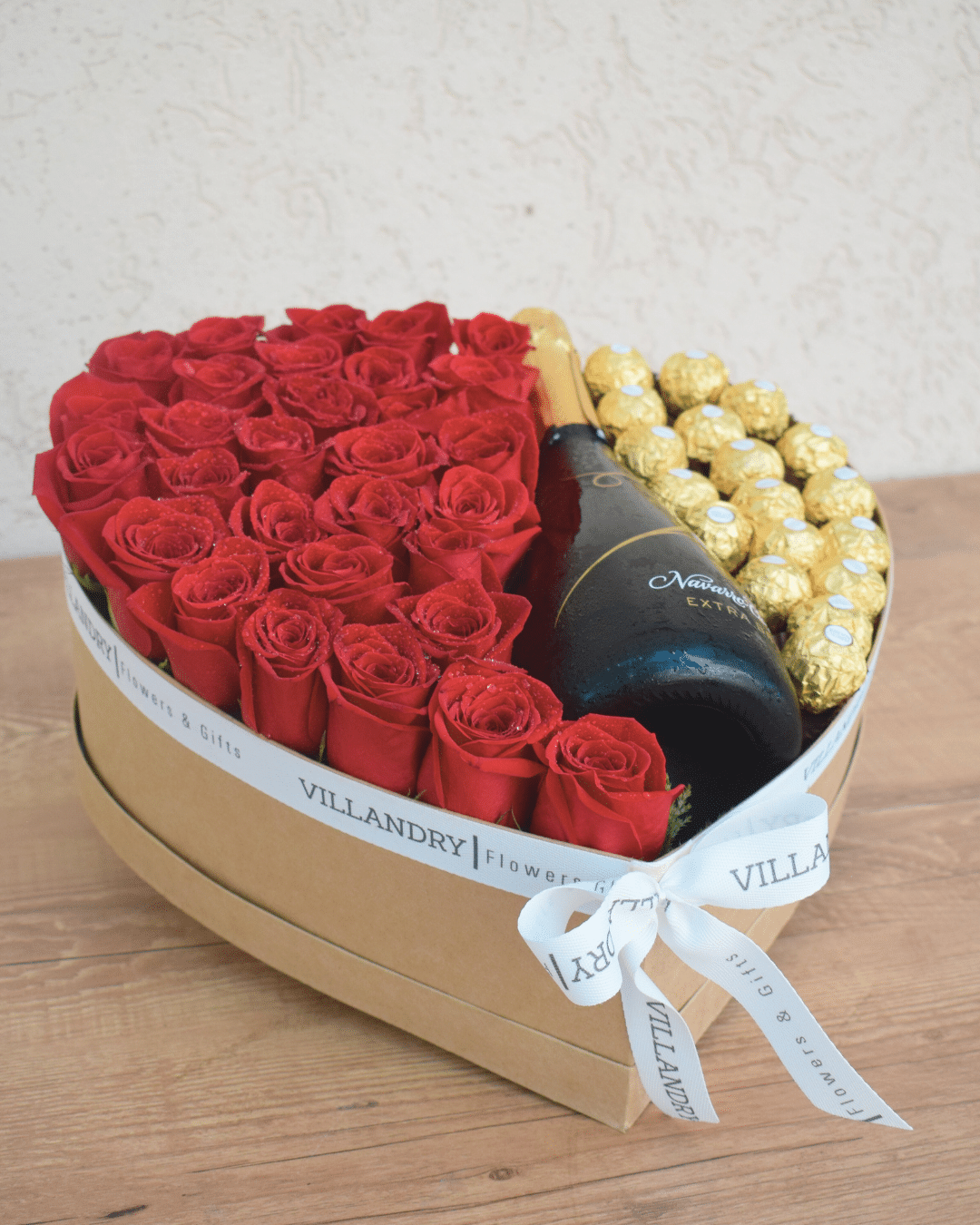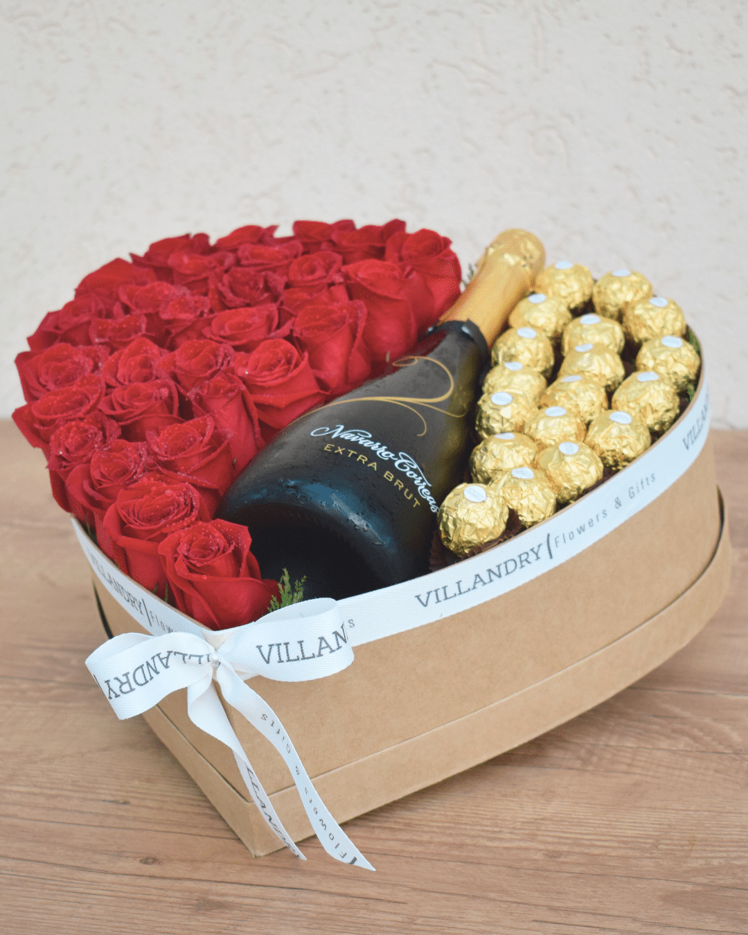 Caja con forma de corazon en kraft con 1 espumante Navarro Correas Extra Brut, bombones Ferrero Rocher y rosas rojas