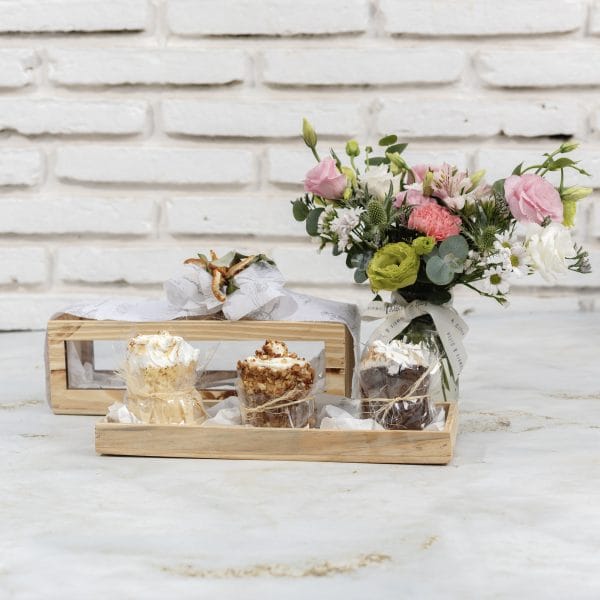 Canasta de madera Maria Castaña, con arreglo de girasoles. La canasta contiene: Cookies, vainillitas, torta de naranja, facturas surtidas, frutas de estación, sandwich de panini, sandwich de huevo revuelto, café con leche o chocolate, mini factura, alfajorcitos, jugo, sacramento con jamón y queso, variedad de chipitas. Variedad de flores y globos sujeta a disponibilidad – Agendamos pedidos con 24 horas de anticipación
